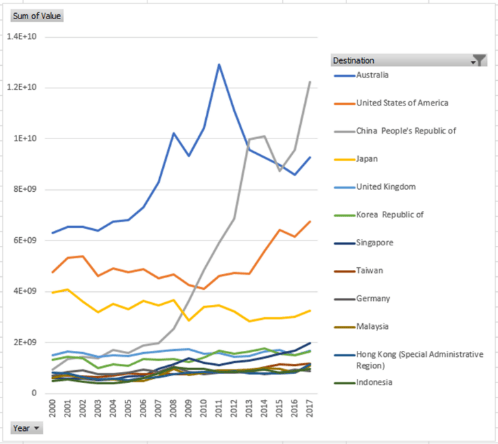 2000年以來新西蘭的累積貨物出口目的地,前四位分別是澳大利亞,美國,中國與日本。澳,美是新西蘭的傳統盟邦,出口市場佔據冠亞軍的位值合乎常識,略有擴大,大概是經濟擴張的緣故。有趣的是日本,它處於一種穩定的萎縮狀態。日本這樣一個崇尚櫻花,追求勃興的民族,卻表現出FADE AWAY,不啻是一種窘境。2009年開始,新西蘭貨物對中國的出口急劇擴張。使得中國能位居前三。而年度出口則自2016年開始就位居第一。究竟是什麼導致了這一變化,或在於新西蘭較為特殊的政治地位。