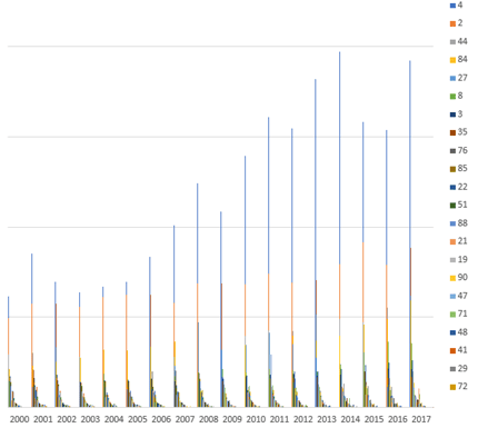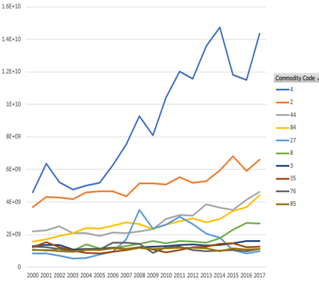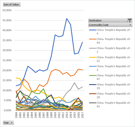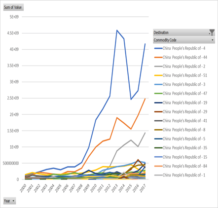新中自貿協定一簽定,為幾類新西蘭經濟格局中的產品打通了銷路, 其中奶製品(04),森工產品(44)以及肉類(02在混沌中佔了先機,特別是奶製品行業,對華出口佔了2017年新西蘭總出口值的三分之一。中國人不大消費奶酪,鮮奶價值過低,所以出口到中國的奶製品主要也就是奶粉。奶粉的主要消費者大概是銜着奶嘴的毛毛。2000年的新西蘭奶製品產業只比位居第二的肉製品產業略顯優勢,到2017年,奶製品在新西蘭成了絕對主導產業,比位居第二的肉製品產業整整多了一倍有餘。壯哉。中國毛毛,你們的奶嘴奠定了一個萬里之外的發達國家的產業格局。以前都説新西蘭是羊多過人,如今的狀況大概還是牛奶更養人。