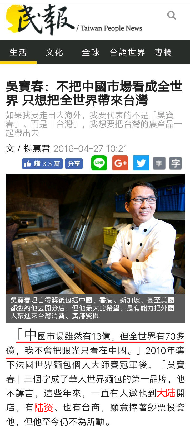 包括吳寶春後面也直説,那幾年,一直有人邀請他到大陸開店,有陸資,也有台灣,願意捧着鈔票投資他,但他不為所動。