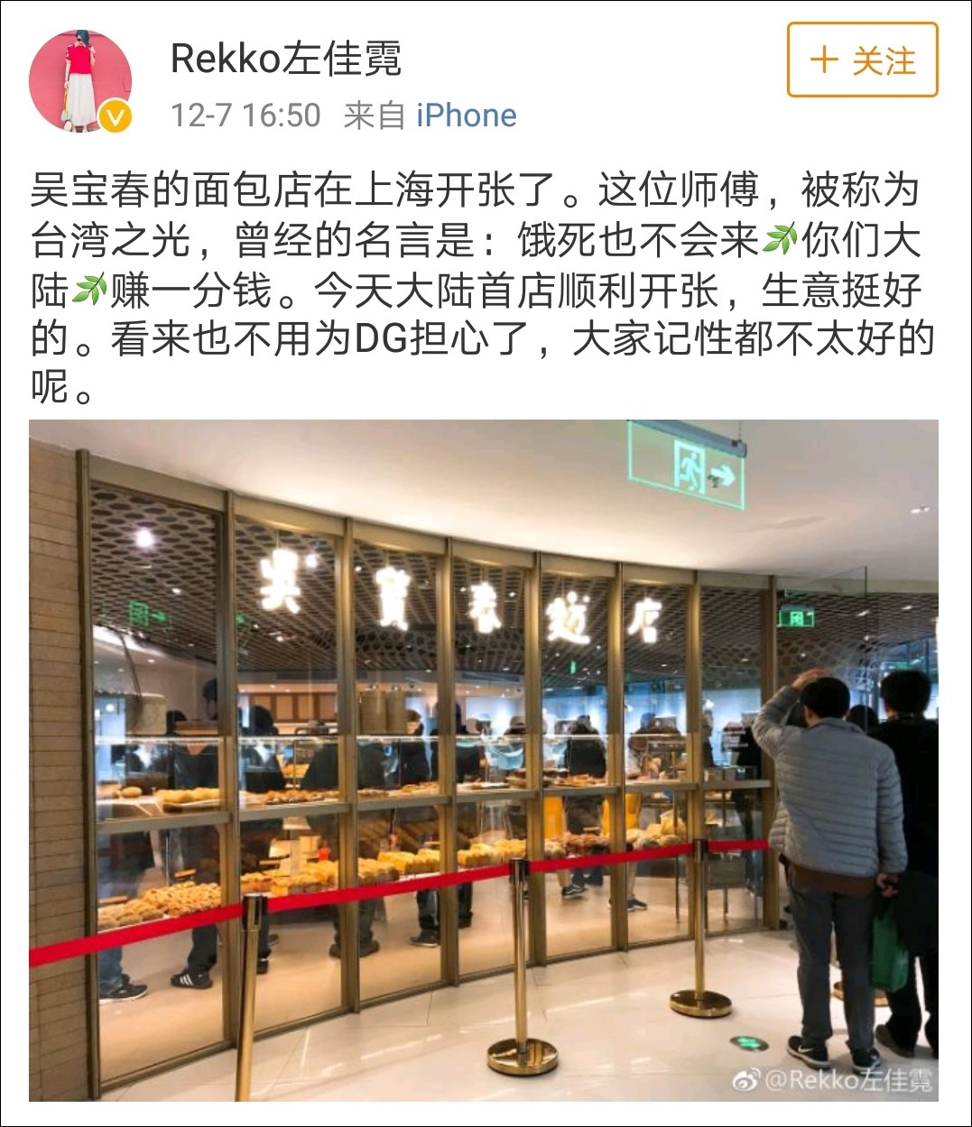 哪怕在開店之前,吳寶春本人出來接受一家媒體的採訪説,自己承認“九二共識”,認為兩岸同屬一中、兩岸一家親都是好的。