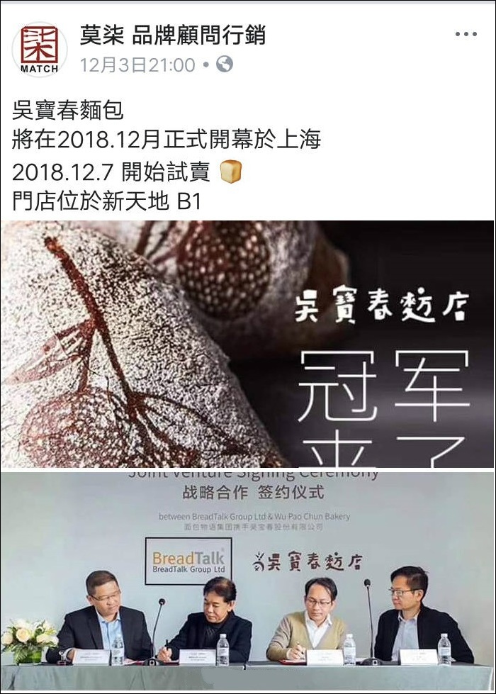 宣傳公司前幾天也大喇喇地宣佈消息説,“吳寶春麪包將於2018年12月正式開幕於上海,2018.12.7開始試賣,門店位於新天地B1”,完全不帶遮掩的。