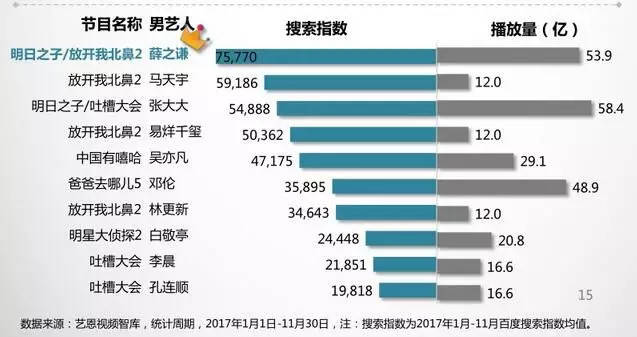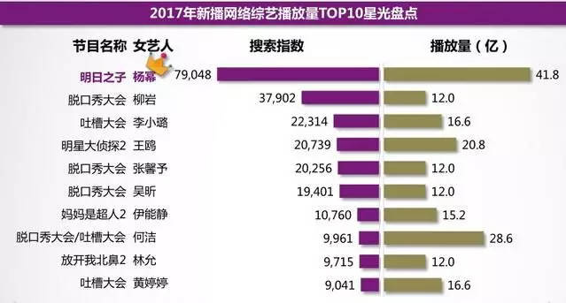 藝恩數據《2017中國網絡綜藝市場白皮書》顯示,網綜越來越受大牌明星青睞,頭部網綜星光閃耀,薛之謙、楊冪分別奪得年度網綜最具影響力男女藝人榜單冠軍。由於明星的帶動,2017年的《吐槽大會》由李小璐、黃婷婷、李晨、孔連順參與的4期節目播放量均超過了16億次,位居2017年新播網絡綜藝播放量男、女藝人榜TOP10。