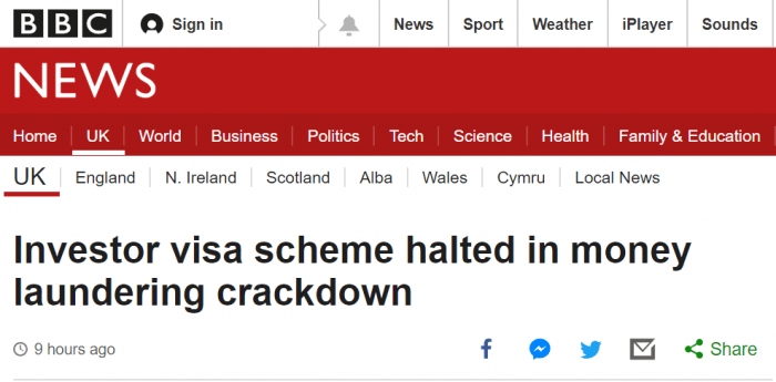 這個新聞的來源並不是政府網站,而是出自BBC、《衞報》等英媒的報道。報道表示,英國正在打擊金融犯罪,主要是打擊“洗錢”,因此會暫停一項被稱為“鍍金”簽證政策,該政策成為外國投資者在英國快速定居的渠道。這一政策正是2008年開始實施的Tier 1投資者簽證中的200萬英鎊投資移民簽證。