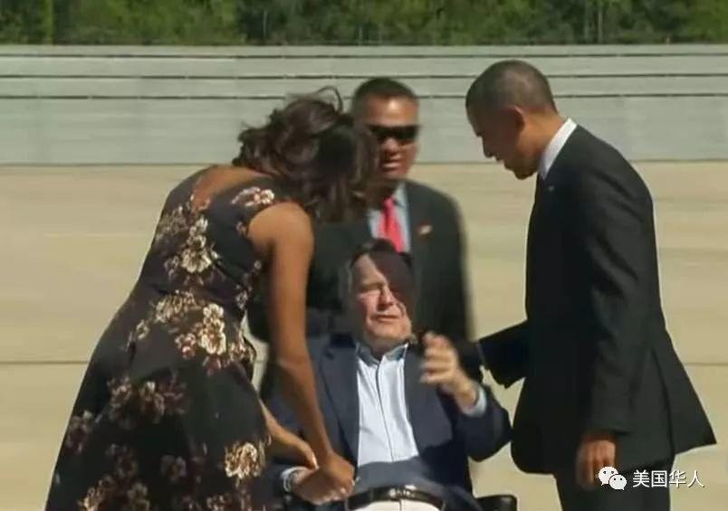 坐在輪椅上的老布什親自去機場迎接奧巴馬伕婦。(圖片來自YouTube視頻截屏)