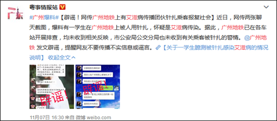 廣州地鐵有艾滋病傳播團伙針扎乘客報復社會?謠言!