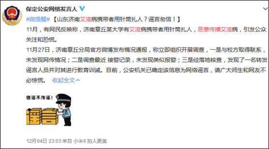 山東濟南艾滋病攜帶者用針筒扎人?謠言!