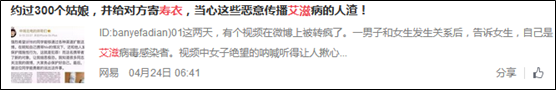 事實上,“我有艾滋病且故意通過性行為傳播給其他人”這樣的傳聞並不少見,還記得之前網上還流傳過一個視頻,一名女子蹲在地上哭喊:為什麼要找我?而男子則笑着説自己“艾滋病是中期,不會傳染”。