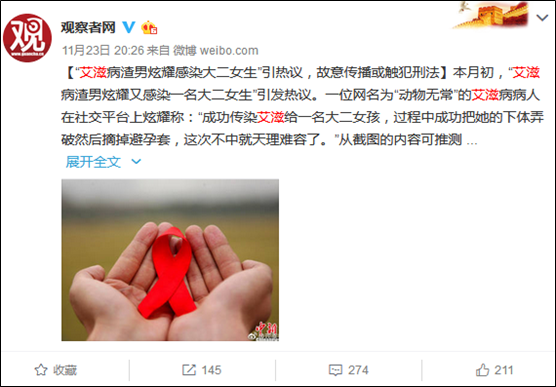 今年六月份,一微信名為“動物無常”的男子在微信羣裏大肆炫耀自己成功將艾滋病傳染給一名大二女孩,聊天記錄流出後,引起公眾廣泛關注。