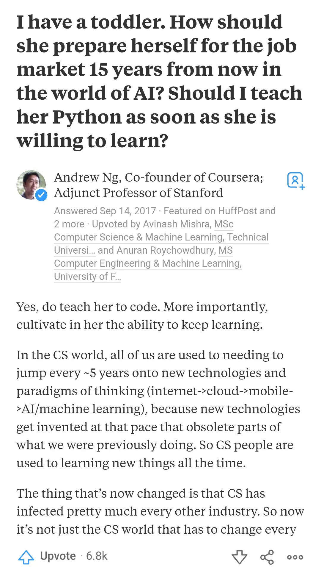 前百度首席科學家、人工智能和機器學習領域最有權威的華人之一吳恩達在這個問題下寫道: