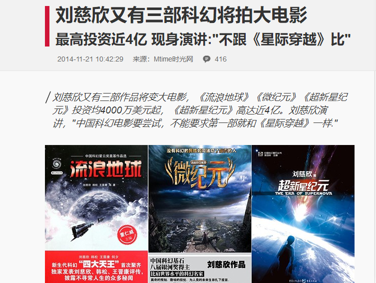 我們梳理網上關於《流浪地球》的相關資料,可以發現,這部電影最早是2014年年底傳出了將拍攝電影的消息,中影一次性買下劉慈欣3本小説的版權。根據推測,中影買電影版權的時間,應該就是在2013年左右。