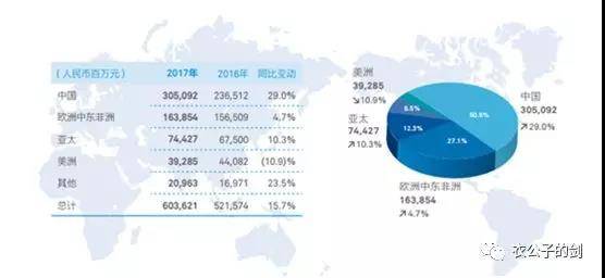 2017年華為營業收入洲際分佈,來源:華為2017年年報