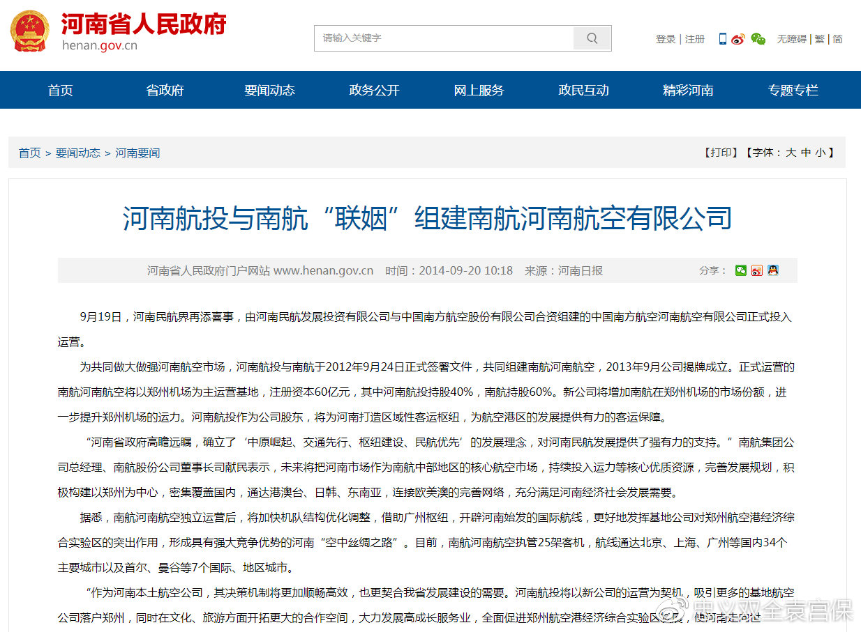 根據河南省人民政府發佈的消息,2012年9月24日正式簽署文件,河南出資方與南航共同組建南航河南航空,經過兩年蹉跎2014年9月公司揭牌成立。2014年9月,南航河南航空正式運營,其中河南航投持股40%,南航持股60%。然後河南航空機隊繼續以每年一架的速度增長。2007年18架,2014年24架,2017年29架,且平均機齡超過9年,是南航整體平均機齡的1.5倍。