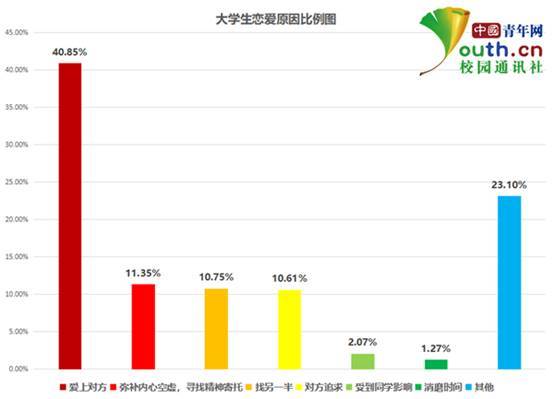 大學生談戀愛的目的是什麼?數據顯示,40.85%的大學生戀愛原因是“愛上對方”,其次是為了“彌補內心空虛,尋找精神寄託”和“找另一半”,分別佔11.35%、10.75%。