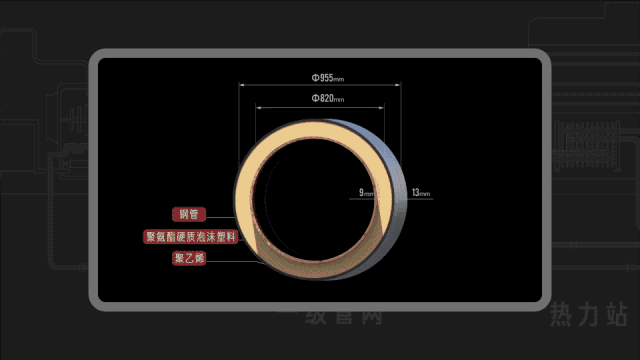 其中的管道分為三層,裏面是鋼管,最大外徑達 820mm ,最小壁厚 9mm ;外面是堅硬的聚乙烯外護管,最大外徑達 955mm,最小壁厚 13mm ;中間填充着不易導熱的聚氨酯硬質泡沫塑料用以保温。