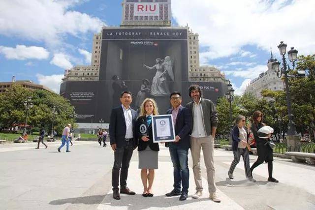 西班牙首都馬德里西班牙大廈主立面上,展示的華為P20Pro手機廣告獲頒最大户外廣告吉尼斯世界紀錄。