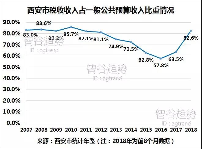 2016年,西安市的税收收入從同期408.6億元鋭減到370.5億元,以至於税收收入佔比一般公共預算收入只有57.8%,為十年來最低。