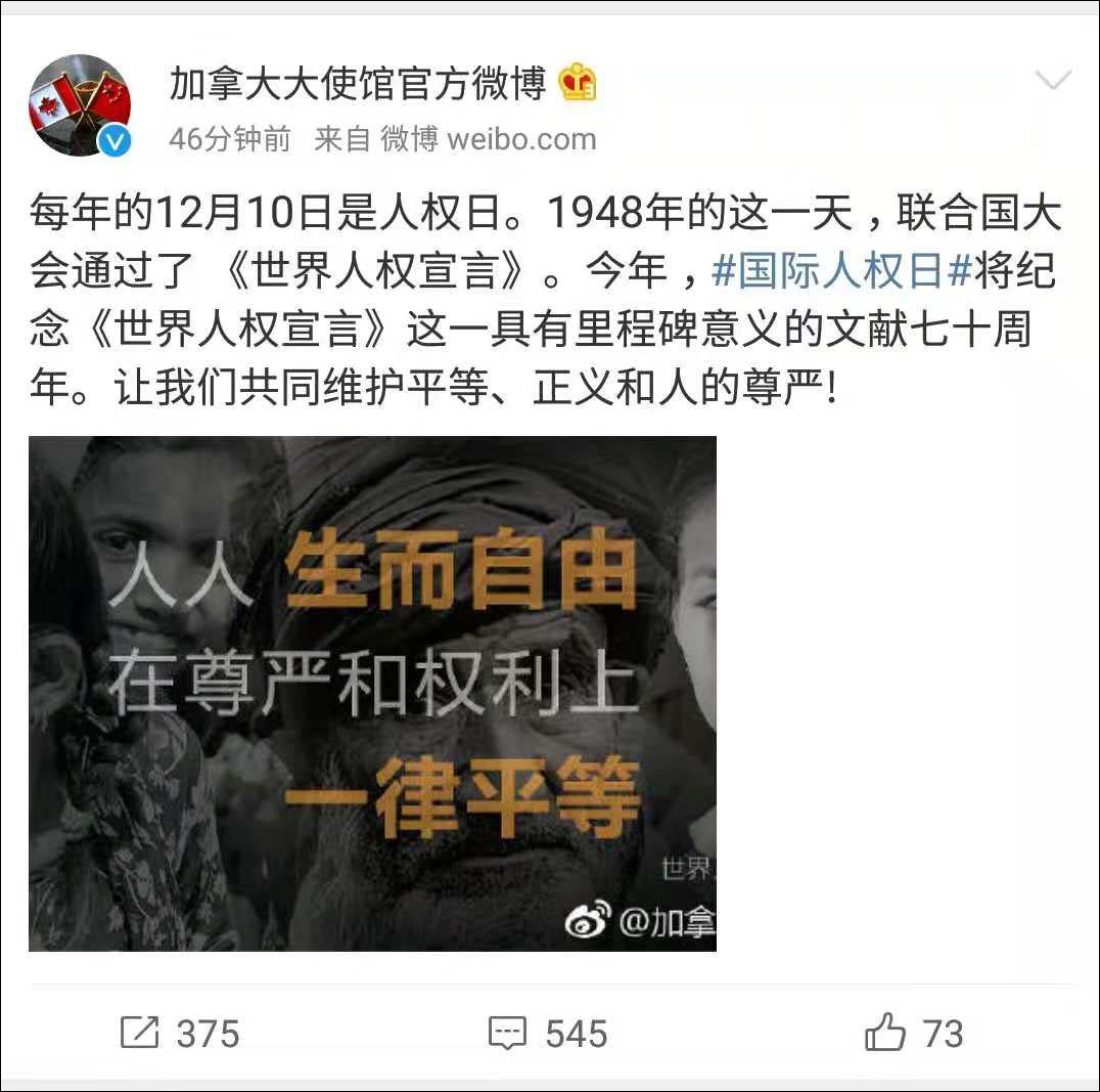 今天下午,加拿大駐華大使館官方微博發佈了這麼一條微博,並宣稱“讓我們共同維護平等、正義和人的尊嚴”。