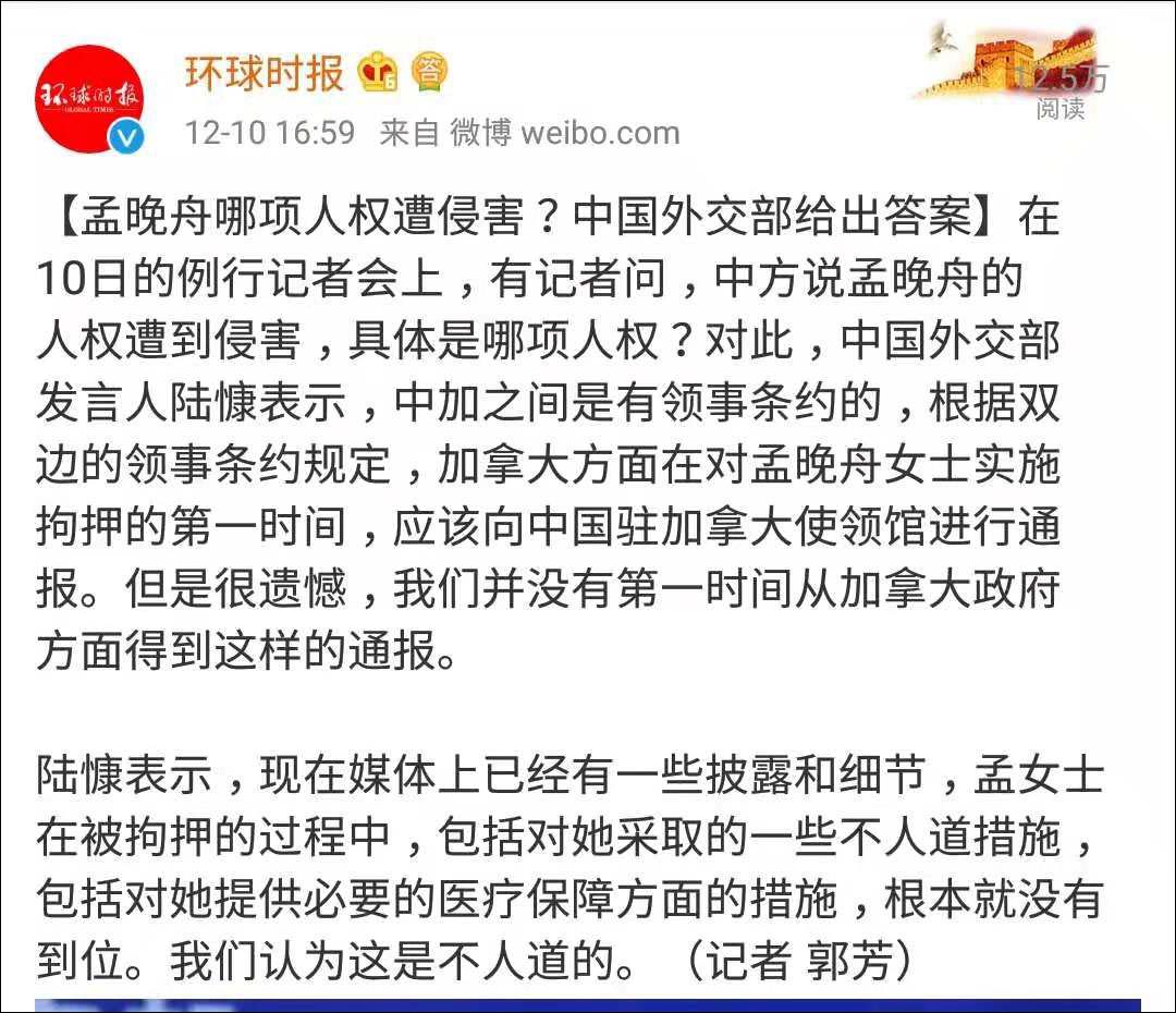 在10日的例行記者會上,有記者問,中方説孟晚舟的人權遭到侵害,具體是哪項人權?對此,中國外交部發言人陸慷表示,中加之間是有領事條約的,根據雙邊的領事條約規定,加拿大方面在對孟晚舟女士實施拘押的第一時間,應該向中國駐加拿大使領館進行通報。但是很遺憾,我們並沒有第一時間從加拿大政府方面得到這樣的通報。