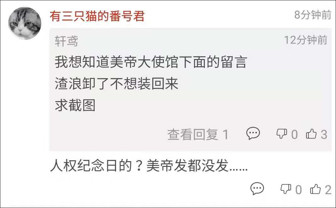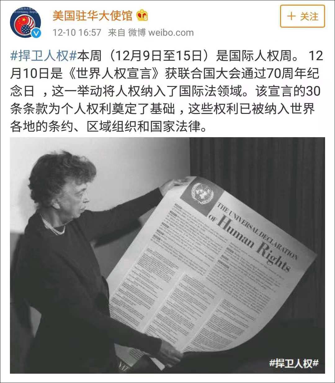 然而,時隔一小時之後,美國駐華大使館也發微博宣稱“捍衞人權”。