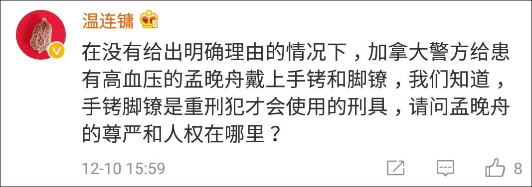 在未經審判定罪的情況下,給孟晚舟女士戴上適用於重刑犯人的刑具,直接將她作為重刑犯人對待,是對其基本人權的踐踏和對其人格的侮辱。