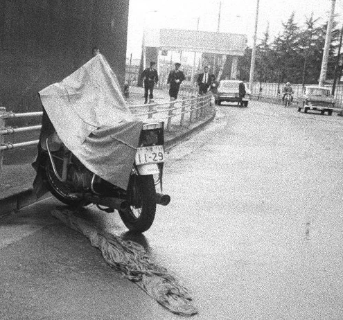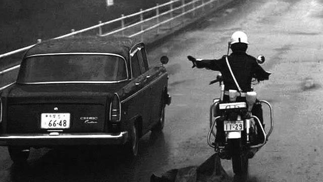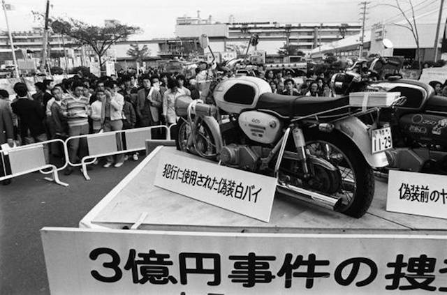 3億日元事件的犯人在現場留下的偽造白色摩托警車,還拖着薄布。