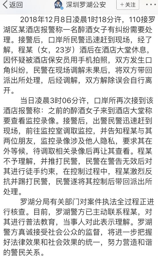 隨後@深圳羅湖公安 發佈聲明,稱該女子推打民警,“民警在警告無效後對其進行徒手約束,在控制過程中,程某激烈反抗並踢打民警,民警遂將其控制後帶回派出所處理”。