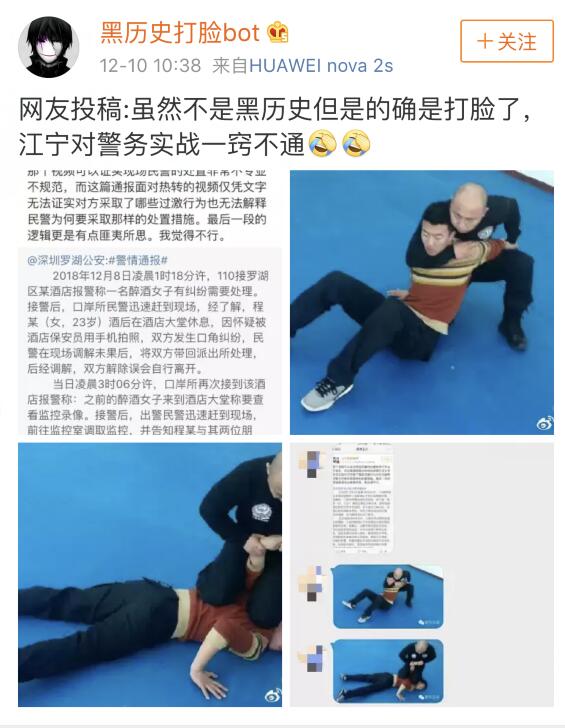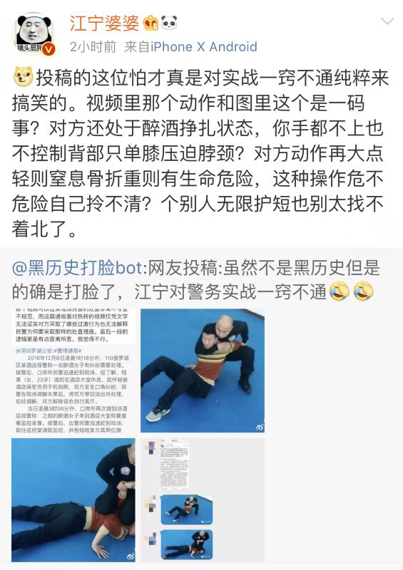之後,@黑歷史打臉bot 掛出一篇網友投稿,網友帶圖評論:江寧(婆婆)對警務實戰一竅不通。