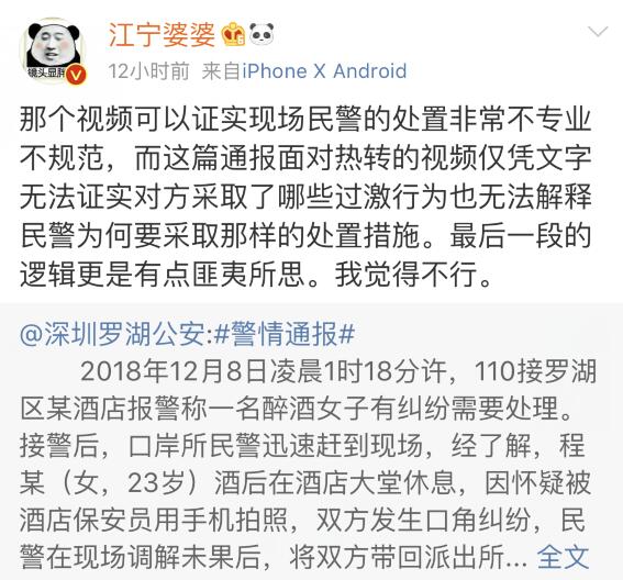 通報發出之後,@江寧婆婆 轉發了這條微博,並表示“現場民警的處置非常不專業不規範”,通報“最後一段的邏輯更是有點匪夷所思,我覺得不行”。