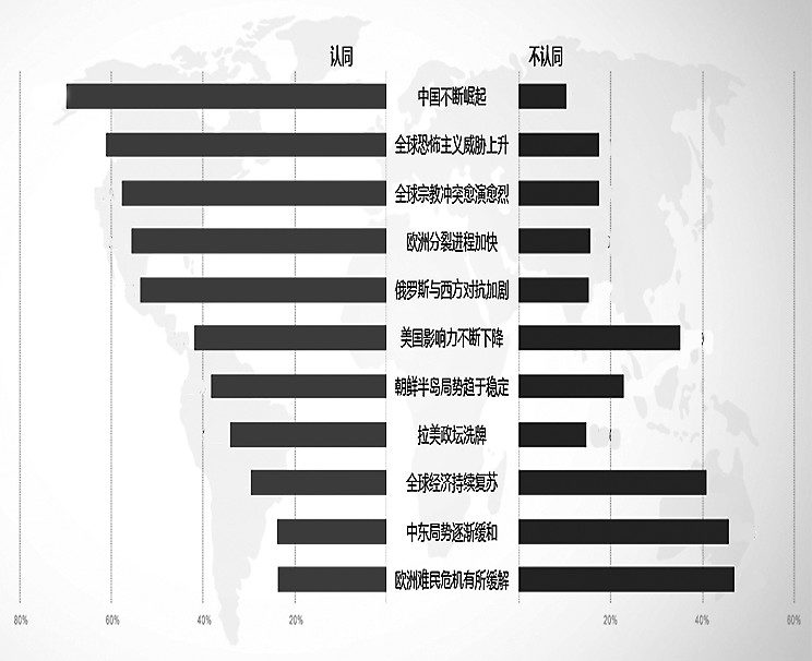 而認同率最低的是“歐洲難民危機有所緩解”、“中東局勢逐漸緩和”和“全球經濟持續復甦”。