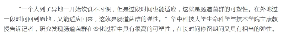 腸道菌羣由微生物按照一定的比例組成,這些微生物的組成及相對比例是在長期生活中逐漸形成的,每個人都不一樣,到一個新地方後飲食改變,影響了原來的腸道微生物,而腸道微生態的失調可能要為其中的“水土不服”症狀負責。