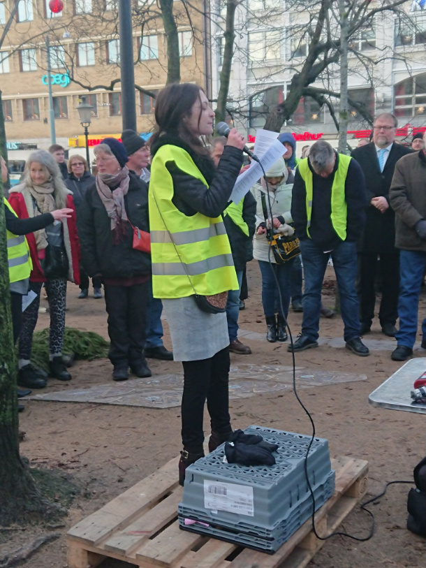 而且,瑞典版的黃馬甲已經開始越出斯德哥爾摩,連第二大城市哥德堡也出現了,比如在哥德堡的Brunnsparken,右翼也不遑多讓,把孩子拿了出來。