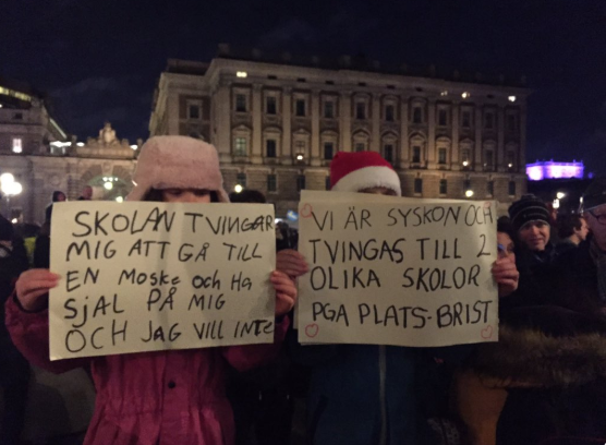 這是一對小姐妹,打出橫幅,説當地的學校強迫她們去清真寺參觀,還強迫他們戴頭巾