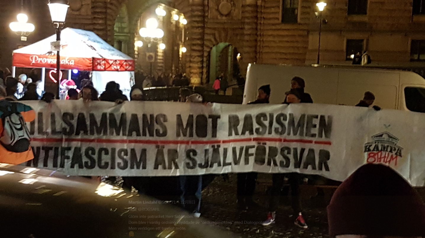 之前説過, 11月27號瑞典民間右翼人士Håkan Bergmark號召斯德哥爾摩的民眾走向街頭,抗議聯合國的新的難民協議(12月10-11日,聯合國將在摩洛哥的Marrakech搞一個新的全球難民協議),並且在Facebook上打出口號“Stockholmare för ett suveränt Sverige”(斯德哥爾摩人為了偉大的瑞典而戰),相約在老皇宮不遠的國會大廈前的Mynttorget遊行示威。