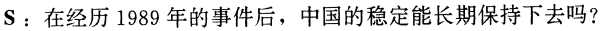 何:去年的事件對中國來説是一次急性熱病,是一塊硬傷、外傷。它來得快、好得快。我看中國決策方面,對十年改革,對去年的事件,已經吸取了足夠的經驗教訓。中國目前的內外方針相當明智。我確信中國的穩定長期持續毫無問題,即使目前還存在着某些困難。