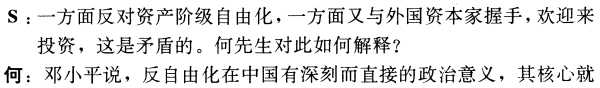 何:我不是保守主義,我毫無保留地支持鄧小平的社會主義改革方針。但對改革的方向,我與那些現在逃去西方的人,政見十分不同,如此而已。