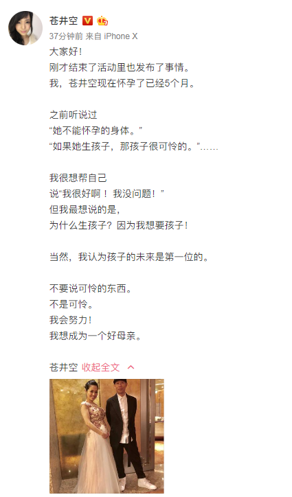 最後蒼井空分享她懷孕的消息:我成為人妻、也即將為人母。好緊張、又好幸福!已懷有五個月的身孕。蒼井空説,今年初她公佈結婚時,心情非常緊張,很怕被粉絲“討厭”,出道16年,自己根本沒想到會有今天這一天,一切感到不可思議。