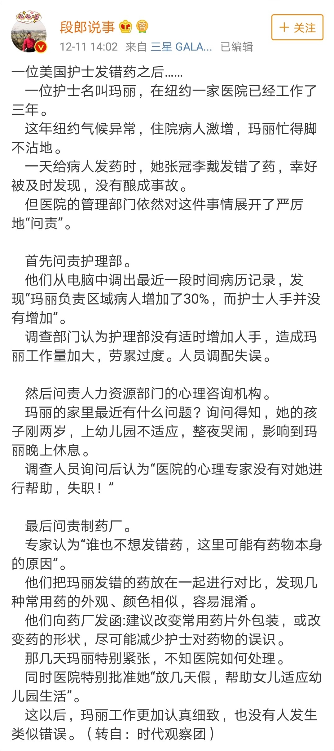 可以看到在完整文章中,這個名叫瑪麗的護士用藥失誤後,醫院的管理部門問責了護理部、人力資源部門的心理諮詢機構,也問責了製藥廠。涉事的瑪麗不僅是沒有承擔任何責任,反而得到了醫院方面的幫助,讓保險公司去應對病人的索賠,又安排義工幫忙解決她的個人生活問題。