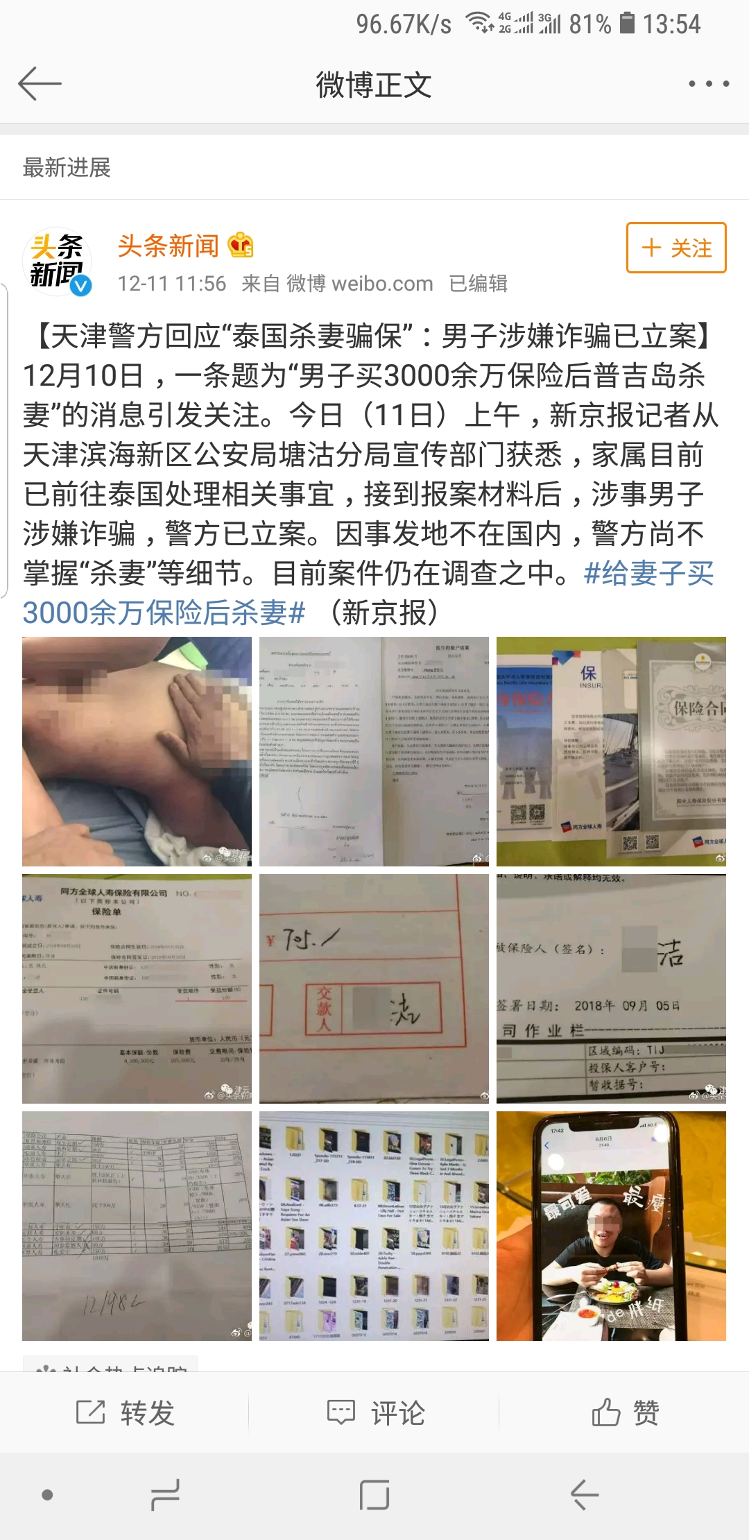 12月10日,一條題為“男子買3000餘萬保險後普吉島殺妻”的消息引發關注。今日(11日)上午,新京報記者從天津濱海新區公安局塘沽分局宣傳部門獲悉,家屬目前已前往泰國處理相關事宜,接到報案材料後,涉事男子涉嫌詐騙,警方已立案。因事發地不在國內,警方尚不掌握“殺妻”等細節。目前案件仍在調查之中。