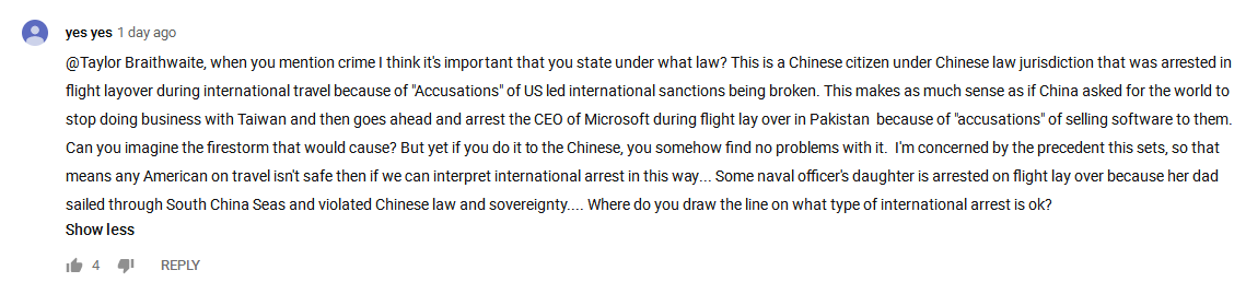 yes:如果説華為犯了法,那具體來説觸犯了哪國的法律?孟是一名中國公民,受中國法律約束,但她卻在乘坐國際航班轉機時被捕,理由是她違抗了美國對伊朗的制裁。這好比中國要求世界各國斷絕與台灣地區的經濟往來,如果微軟CEO敢賣軟件給台灣就趁他在巴基斯坦轉機時把他扣下來。不難想象這麼做會導致火山爆發般的結果。但美國卻實實在在對中國這麼幹了,你覺得這也OK?我擔心此次事件開了一個頭,如果我們如此這般解釋國際拘捕,那美國人出國旅行哪裏還有安全可言?如果美國海軍艦船開進中國南海的主權海域,侵犯中國法律和主權,那海軍官員的女兒就可能在轉機時被拘捕。我們的底線到底在哪裏?