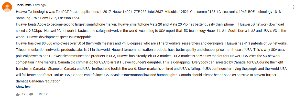 在華為的8萬多名員工裏,有5萬是碩士博士(這是老數據了),他們都是勤奮的工人、研究人員和開發者。華為掌握了5G領域41%的專利,電信產品銷售額世界第一,而且還價廉物美。這就是為什麼美國要動用政治力量禁止華為電信產品進入美國,華為其實已經離開了對它而言微不足道的美國市場。美國電信市場失去了競爭性。這次加拿大幫美國拘押華為創始人之女完全屬於為虎作倀,這是非常愚蠢而且非常可怕的做法。美國靠這種恐嚇手段,只會衰落得更快。加拿大應該和美國劃清界限,停止破壞國際法和人權的做法,並且釋放孟女士,避免傷害加拿大的國際聲譽。