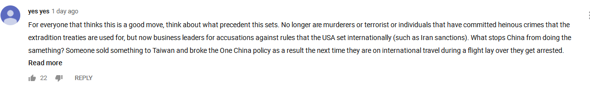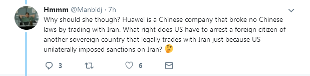 @Hmmm:憑什麼拘捕孟女士?華為是一間中國公司,它跟伊朗做生意又沒有觸犯中國法律。美國有什麼權利拘捕一個主權國家合法與伊朗做生意的公民,就憑美國單方面對伊朗施加的制裁嗎?