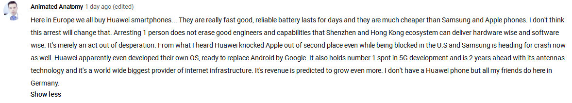 Anatomy:在歐洲我們買智能手機都選華為……速度快質量好電池壽命長,還比三星和蘋果手機便宜。我不認為此番拘捕孟女士將改變這一事實。逮捕一個人不會抹殺工程師們的成績,不會破壞深圳和香港的軟硬件生態系統。美國這樣做屬於病急亂投醫,新聞報道説華為已經取代蘋果成為第二大智能手機廠商,這還是在美國封鎖華為的情況下,而且三星目前每況愈下。華為還在開發自己的操作系統,今後要替代谷歌的安卓系統。華為處於5G開發的領先位置,天線技術領先競爭對手兩年,還是全球最大的互聯網基礎設施提供者。根據預期華為未來收入還會增長。雖然我自己用的不是華為,但在德國我周圍的人都在用。