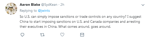 @Aaron Blake:所以美國想制裁誰就制裁誰,想控制貿易就控制貿易嗎?中國何不反過來宣佈對美國和加拿大公司實施制裁,逮捕美加企業的高管。以直報怨嘛。