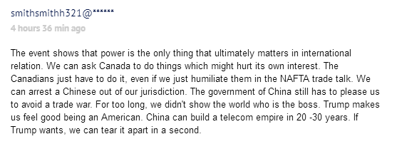 @smithsmithh1:這件事説明國際關係最終還是講實力。即便美國在北美自貿協定上羞辱加拿大,美國仍然可以要求加拿大出面做一些有損它利益的事,加拿大也不敢不從。我們可以在法律轄區之外逮捕中國人,中國為了避免貿易戰也拿我們沒辦法。我們太久沒有讓世界見識一下誰才是老大。特朗普終於給了我們美國人應有的尊嚴。中國可以花二三十年建起電信帝國,只要特朗普願意,一秒就可以拆了它。
