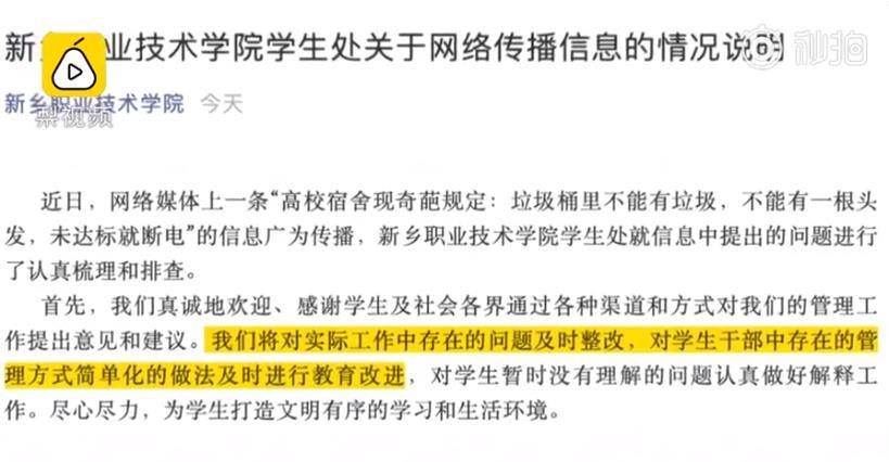 而在今天下午,新鄉職業技術學院在其官方微信公眾號上發佈情況説明稱,感謝社會各界通過各種渠道和方式對學校管理工作提出意見和建議。對學生幹部中存在的管理方式簡單化的做法及時進行教育改進,對學生暫時沒有理解的問題認真做好解釋工作。盡心盡力,為學生打造文明有序的學習和生活環境。