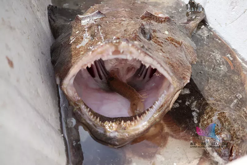 鮟鱇魚長相嚇人,皮膚粗糙,前半截身體像圓盤;後半截身體像細柱子;眼睛以及“杆子”長在頭頂上;一張血盆大口;嘴巴里還長着鋒利而傾斜的牙。