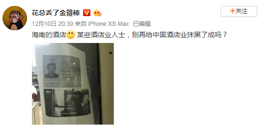 照理説,自己出了問題,就應該承認錯誤好好整改,但一些酒店從業者並不這麼想。比如花總髮博稱的某個海南酒店,甚至將他的個人護照信息和在採訪中的肖像打印並張貼出來,同時備註“暗訪人員關注”。