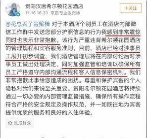 目前,洲際酒店集團已聯繫“花總”的代理律師溝通,並表示泄露“花總”個人信息的是洲際酒店旗下呼和浩特假日酒店員工,但是目前該員工已經離職。而另一家酒店尚未有回應。