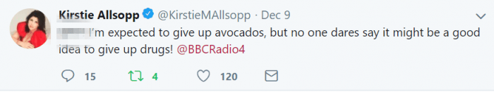 首先,大家的焦點都在牛油果和毒品的關係上。英國著名電視主持人Kirstie Allsopp發推稱:“我應該拒吃牛油果嗎?為什麼沒人建議大家不要去吸毒呢?”