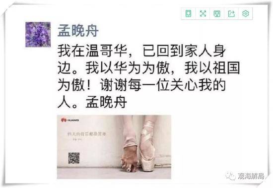 終於獲得保釋後,孟晚舟以“芭蕾腳”為配圖,發了一條朋友圈:我在温哥華,已回到家人身邊。我以華為為傲,我以祖國為傲!謝謝每一位關心我的人,孟晚舟。